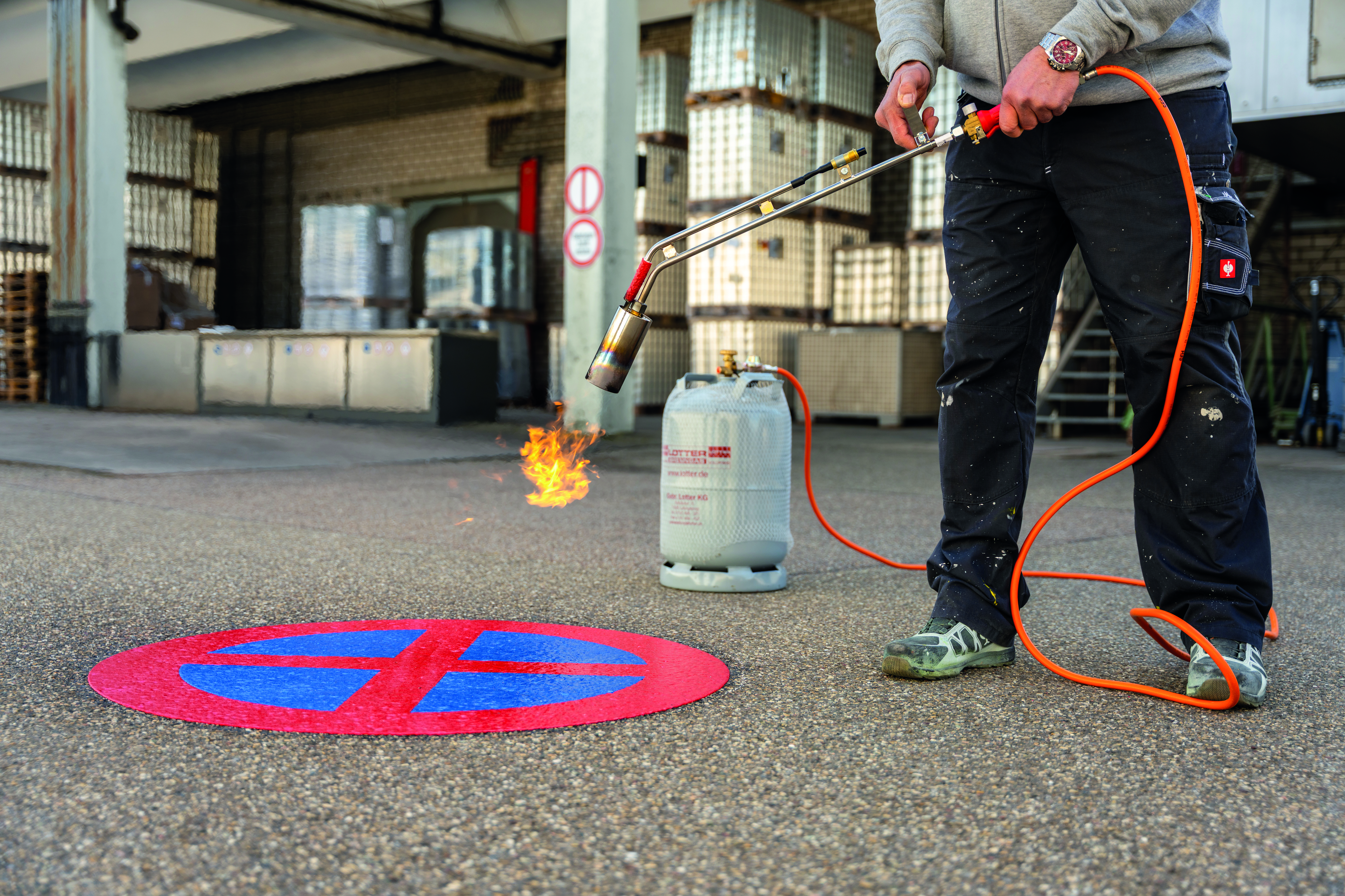 Nach der Reinigung und Grundierung des Untergrunds wird das Thermo-Tattoo passgenau positioniert, mit einem Starkbrenner (119 kW) gleichmäßig erhitzt und dauerhaft mit dem Untergrund verschweißt. Bei Bedarf kann ein Nachstreumittel appliziert werden. Nach rund zehn Minuten ist die markierte Fläche wieder begehbar und voll einsatzfähig. Ein klarer Vorteil, insbesondere bei laufendem Betrieb oder engen Sperrfenstern.